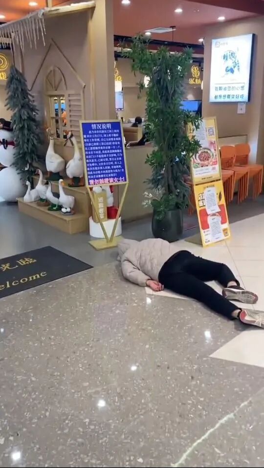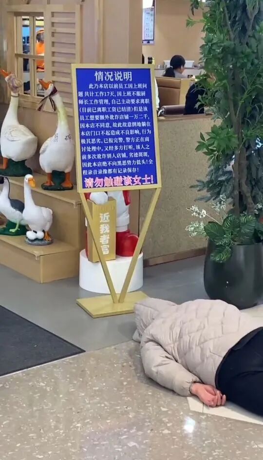 视频显示龙辉优配,女子旁放了一块告示牌:该女子是饭店前员工,工作17天后离职,工资已结清。但她想要额外的钱被拒后,故意躺在这里,“请勿触碰该女子。”